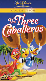 The Three Caballeros was first released in cinemas on 3 February 1945. Production of The Three Caballeros had begun during the war however there were significant delays in its completion because the studio's staff were required to produce government material. After completion there was a further delay as they waited to get enough technicolour prints to release the film in cinemas. The Tree Caballeros expands upon Saludos Amigos and is a bright, fast moving collage of sights and sounds. It has been likened to Disney's Fantasia and while it caused controversy amongst film buffs in 1945, it has recently become one of the most admired Disney features amongst film aficionados. In the film, animation is mixed with live action. It stars Donald Duck, Joe Carioca and Panchito and has strong Brazilian and Mexican influences in music, storylines and settings. Amongst the short stories are; "Aves Raras" (Strange Birds) which features Pablo the Penguin and the crazy aracuan bird. Next is a short story about Little Gauchito and his Flying burrito (donkey), then Donald Duck is featured in a trip around Brazil, guided by his friend Joe Carioca. To conclude, Donald Duck joins with Joe Carioca and Panchito (a Mexican Charro Rooster) to sing the Three Caballeros. |